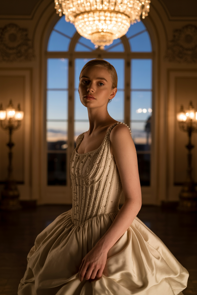 Женщина в роскошном винтажном бальном зале с хрустальной люстрой в классическом свадебном платье с объёмной многослойной юбкой и корсетом, расшитым жемчугом и серебристыми нитями, стоит у большого окна, одну руку держит на подоле, смотрит прямо в камеру, атмосфера аристократичности и торжества.
