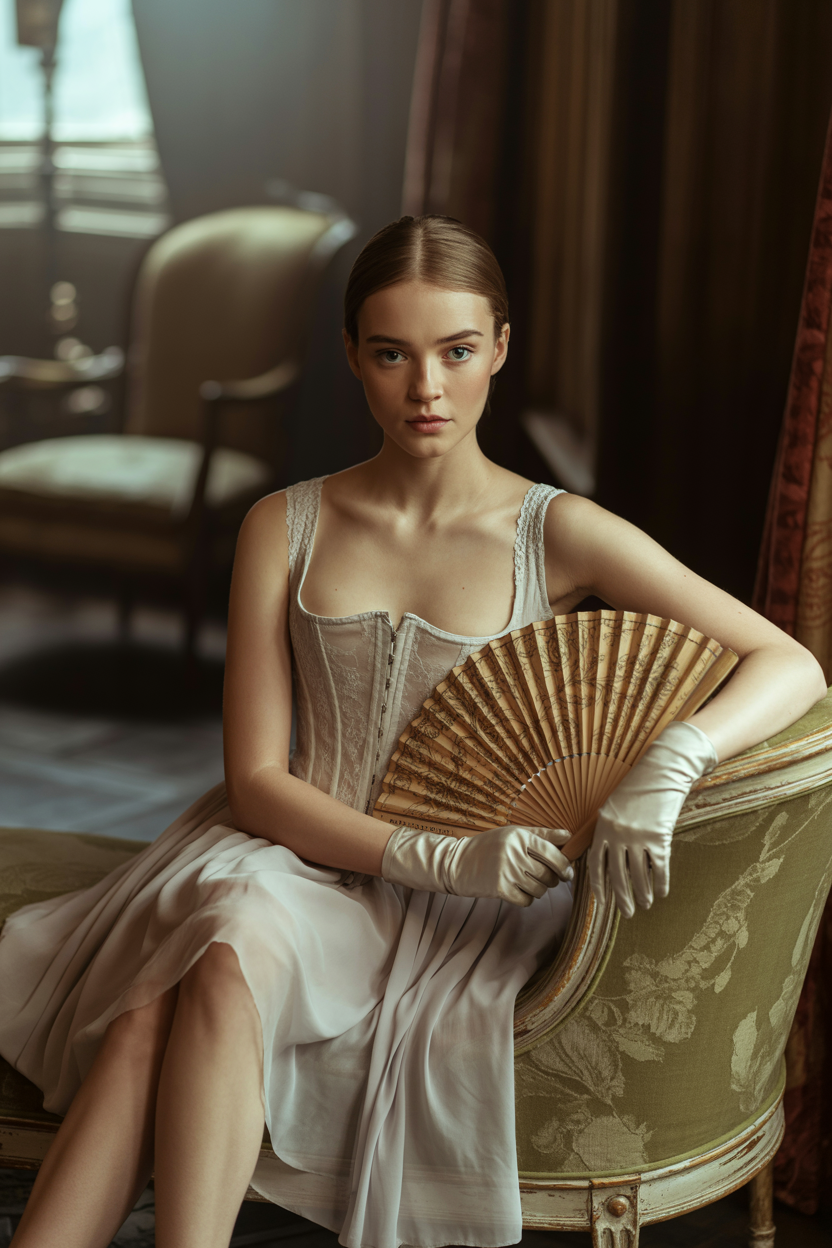 Женщина в роскошной фотостудии с винтажной мебелью, одета в белый кружевной корсет, воздушную юбку из фатина и короткие перчатки. Она сидит на антикварной кушетке, слегка наклонившись вперед, с прямым уверенным взглядом в камеру, рядом расположен старинный веер.