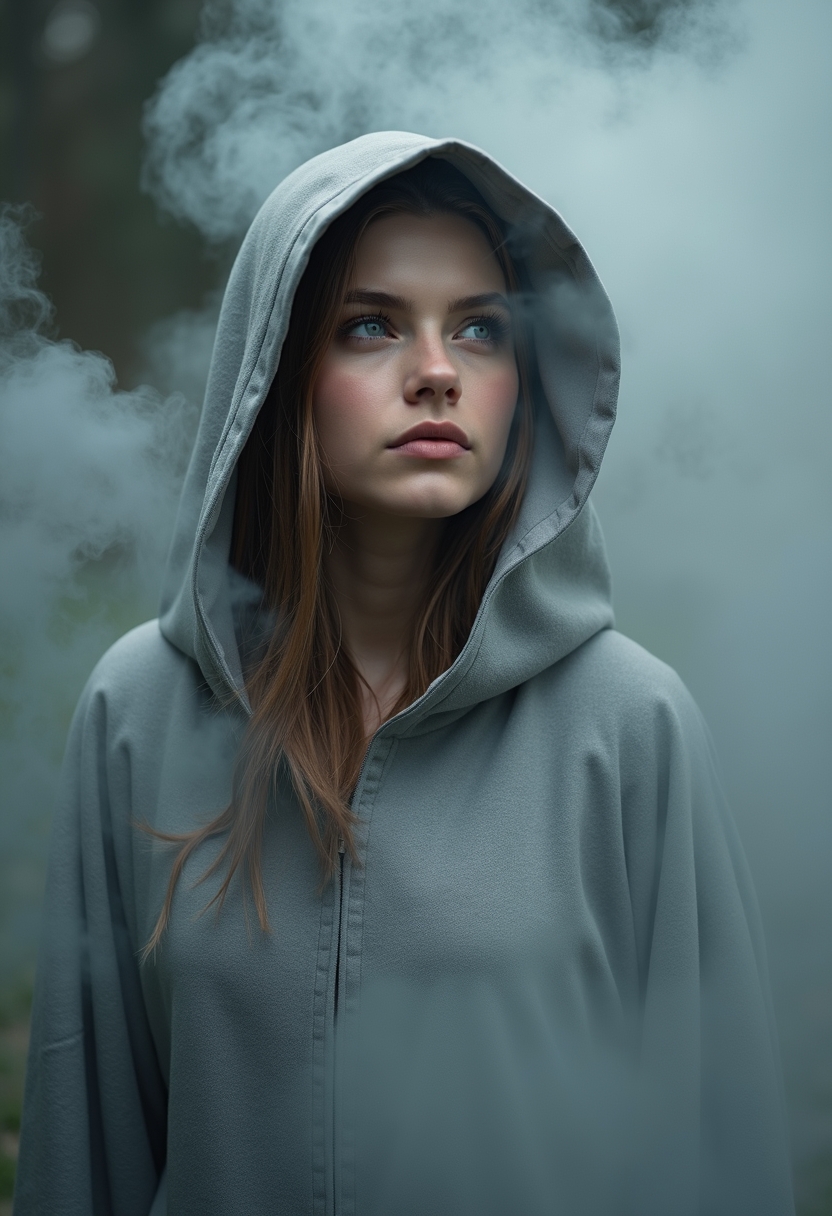 Женщина в серебристом плаще с капюшоном стоит среди клубов густого серого дыма. Её лицо крупным планом, взгляд направлен вверх, а дым подчёркивает мягкость черт. Освещение естественное, акцент на загадочности образа.