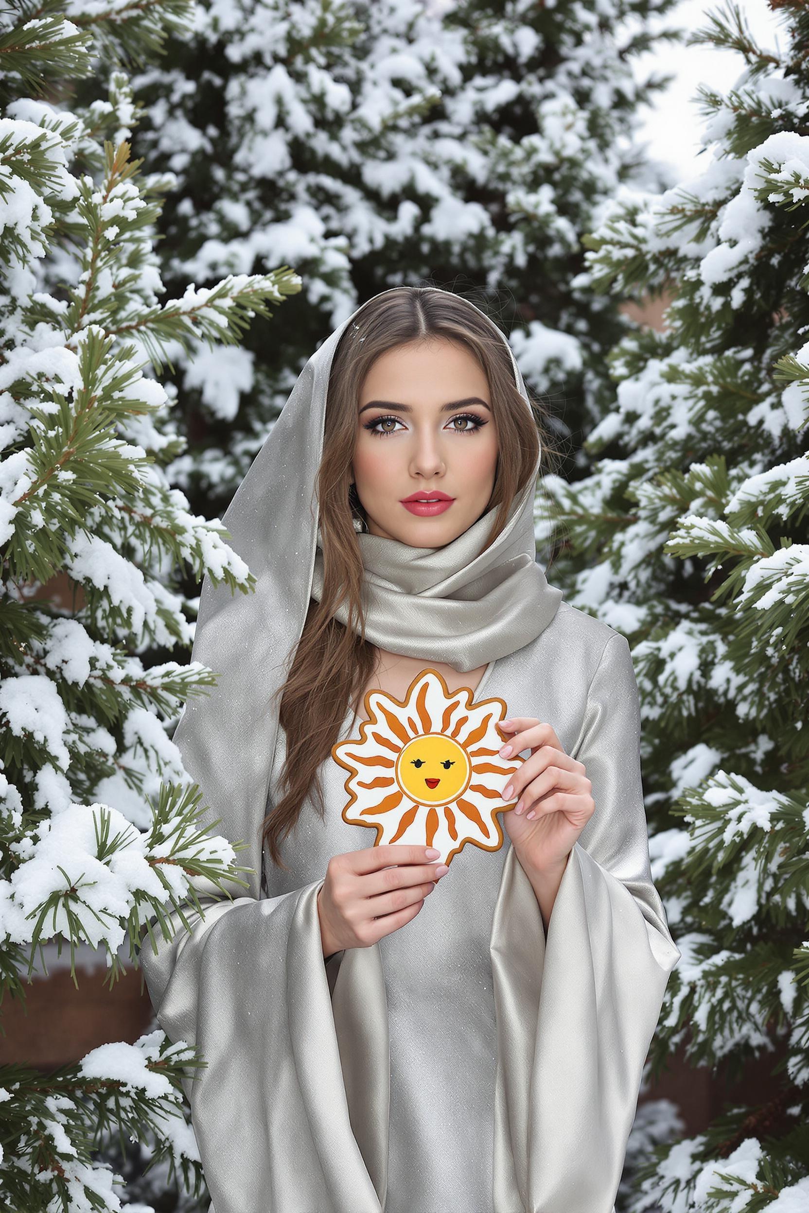 Женщина в серебристом сарафане с рукавами-колоколами и атласном платке стоит среди высоких заснеженных сосен, держит в руках расписной пряник в форме солнца, смотрит прямо в камеру, вокруг лёгкий морозный туман.
