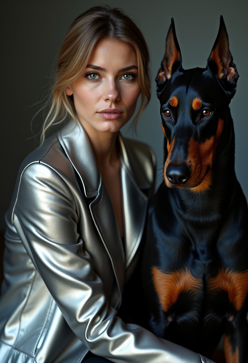 Женщина в серебристом жакете с острыми плечами сидит рядом с доберманом, её лицо крупным планом. Она смотрит через плечо в камеру, выражение лица холодное и дерзкое. Доберман сидит рядом, его морда видна сбоку. Освещение холодное, фон тёмный.