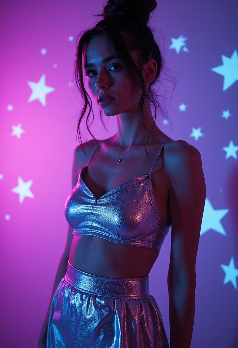 Женщина в серебряной юбке и топе с металлическим блеском стоит в неоново-фиолетовом освещении, на фоне звёздных проекций. Её волосы убраны в пучок, лицо освещено холодным светом. Крупный план, создающий атмосферу космической моды.