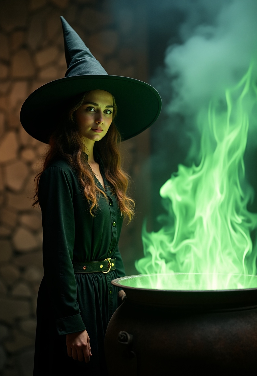 Женщина в шляпе ведьмы стоит у большой чугунной котельной с магическим зелёным пламенем, смотрит прямо в камеру
