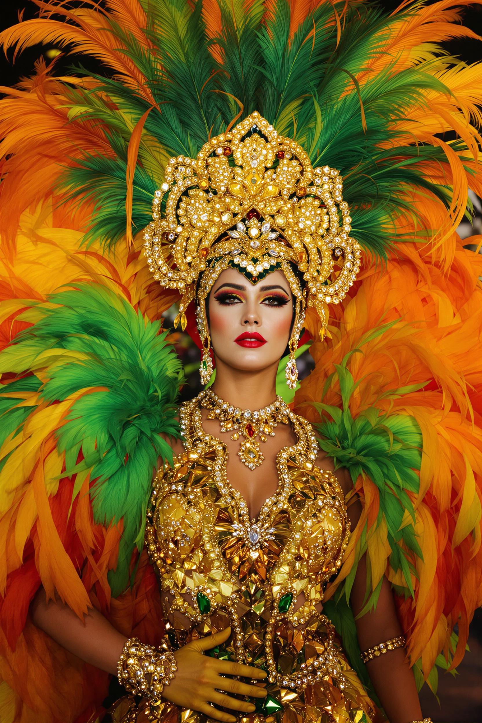 Женщина в сияющем карнавальном костюме: топ из золотых пайеток и камней, пышная юбка из огненно-оранжевых и зеленых перьев, головной убор с длинными перьями, крупные украшения, атласные перчатки, средний план, смотрит в камеру, фон — карнавальные огни Рио.
