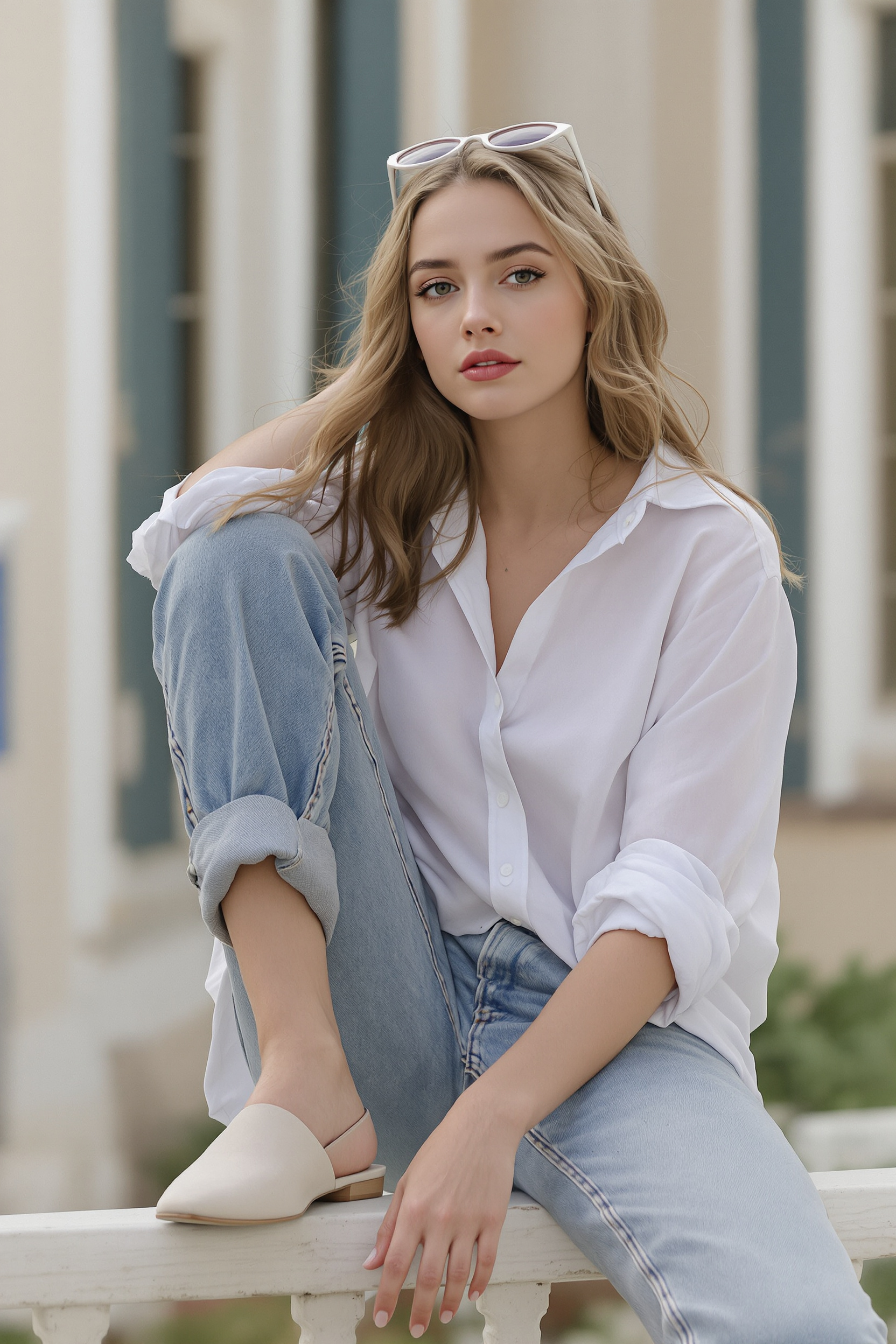 Женщина в слегка потертых джинсах-бойфрендах и объемной белой рубашке с закатанными рукавами. На ней светлые минималистичные мюли. Она сидит на перилах ранчо, поддерживая равновесие одной рукой, вторая свободно лежит на колене. Смотрит прямо в камеру. Фон — пастельная уличная локация.