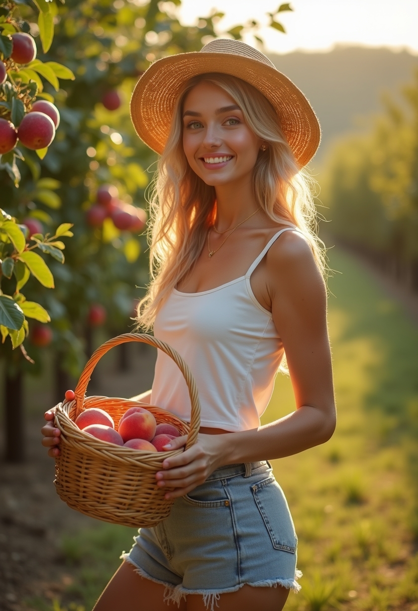 Женщина в соломенной шляпе и коротких шортах держит в руках корзину с персиками, её лицо освещено солнечными лучами, а улыбка лёгкая и непринуждённая. Позади фруктовый сад, где ветви деревьев усыпаны спелыми плодами. Крупный план, создающий атмосферу летней беззаботности.