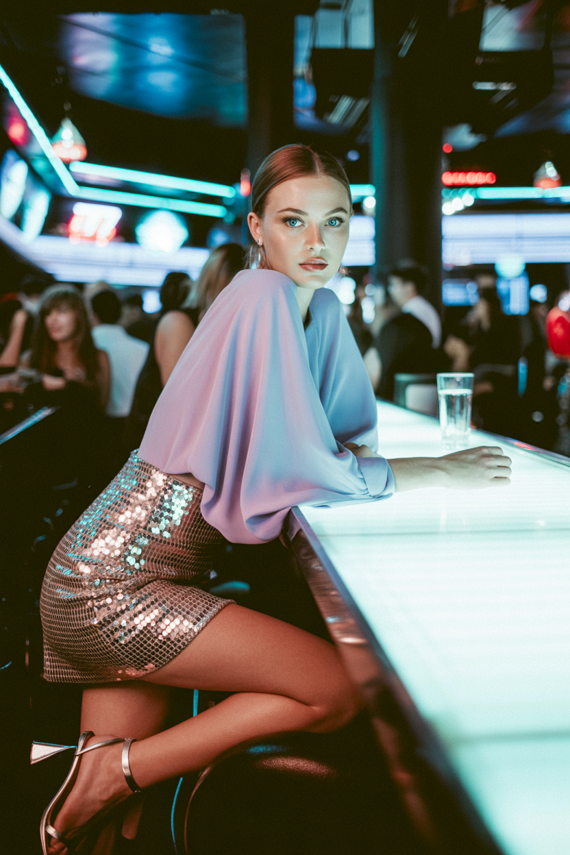 Женщина в современном клубе, одета в лавандовый топ с объемными рукавами и блестящую мини-юбку из пайеток, на ногах серебристые босоножки на каблуке, стоит у подсвеченной барной стойки, оперлась одной рукой и смотрит прямо в камеру. Вокруг неоновые огни и атмосфера вечеринки.