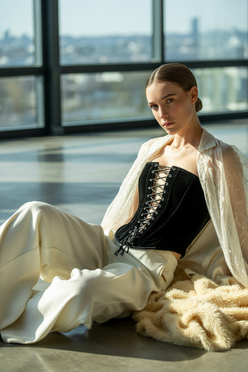 Женщина в современном просторном зале с панорамными окнами, одета в чёрный бархатный корсет с серебристыми шнурками и струящиеся широкие белые брюки, поверх накинут прозрачный плащ. Она полулежит на полу, опираясь на локоть, внимательно смотрит в камеру, рядом пушистый плед.