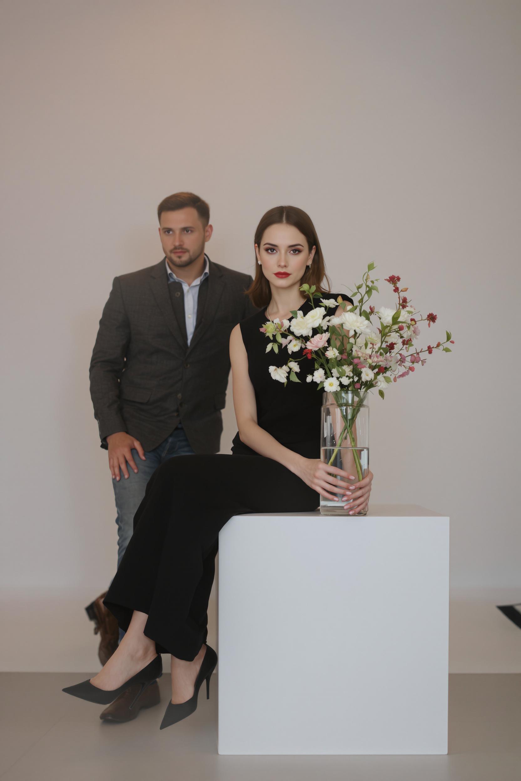 Женщина в спокойной позе сидит на белом кубе на циклораме, обнимая простую стеклянную вазу с цветами. Парень стоит сбоку, опираясь на куб, его лицо скрыто. Она прямым взглядом смотрит в камеру, акцент на минимализме и её утончённости.