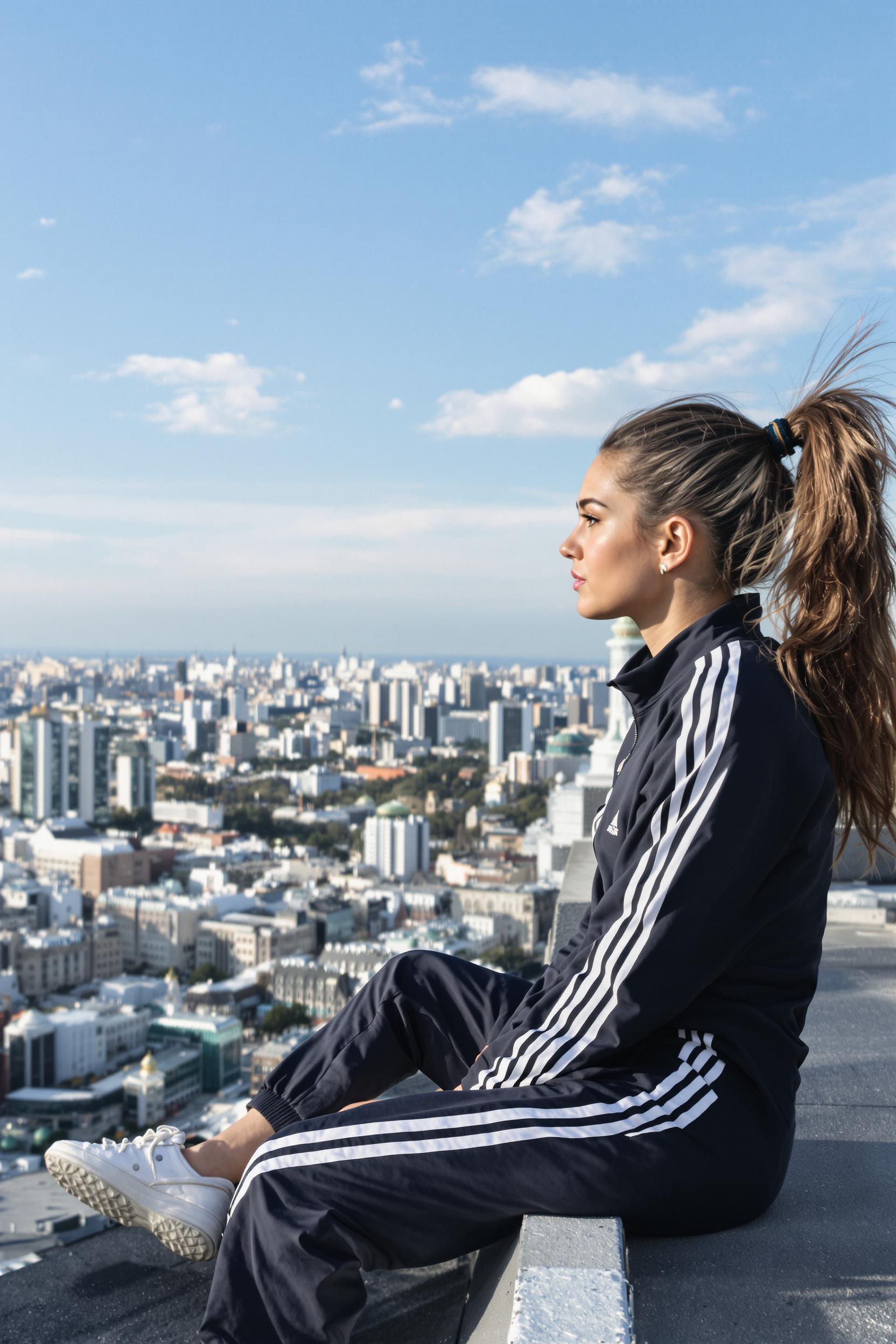 Женщина в спортивном костюме сидит на крыше московской высотки, позади — небо и панорама центра. Она смотрит вдаль, волосы собраны в хвост. Крупный план, урбанистический стиль.