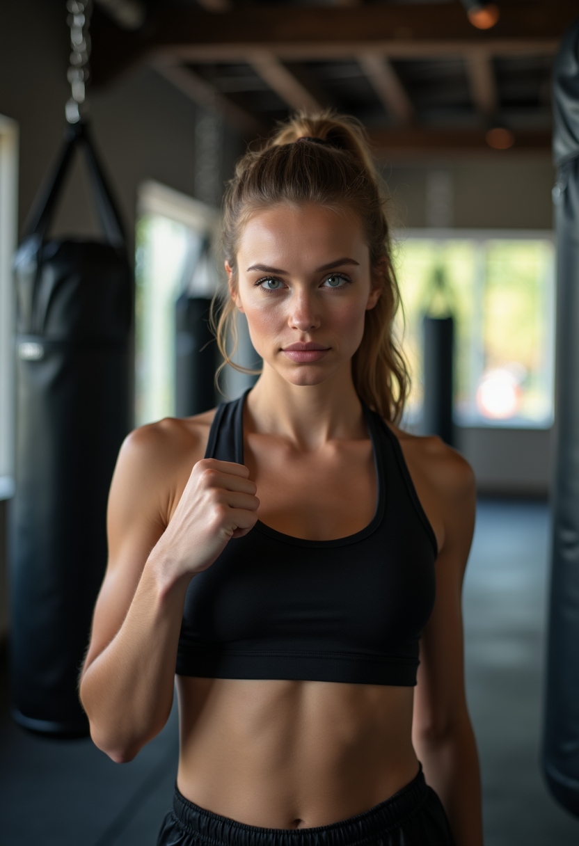 Женщина в спортивной майке стоит в боксерской стойке, прямо смотрит в камеру, вокруг тренировочный зал