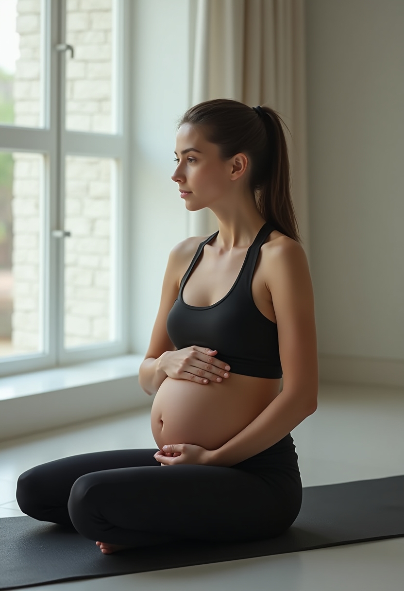 Женщина в спортивной одежде сидит на коврике для йоги, обнимает живот руками, вокруг минималистичный интерьер