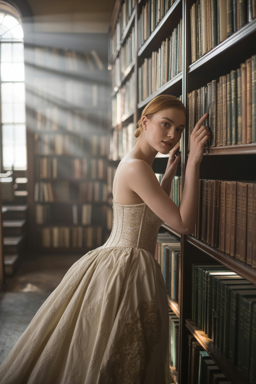 Женщина в старинной библиотеке в элегантном пышном свадебном платье с длинным кружевным шлейфом и вышитым корсетом стоит рядом с высоким книжным шкафом, слегка опирается на полку, смотрит прямо в камеру, позирует в атмосфере уюта и умиротворения, вокруг мягкий рассеянный свет.