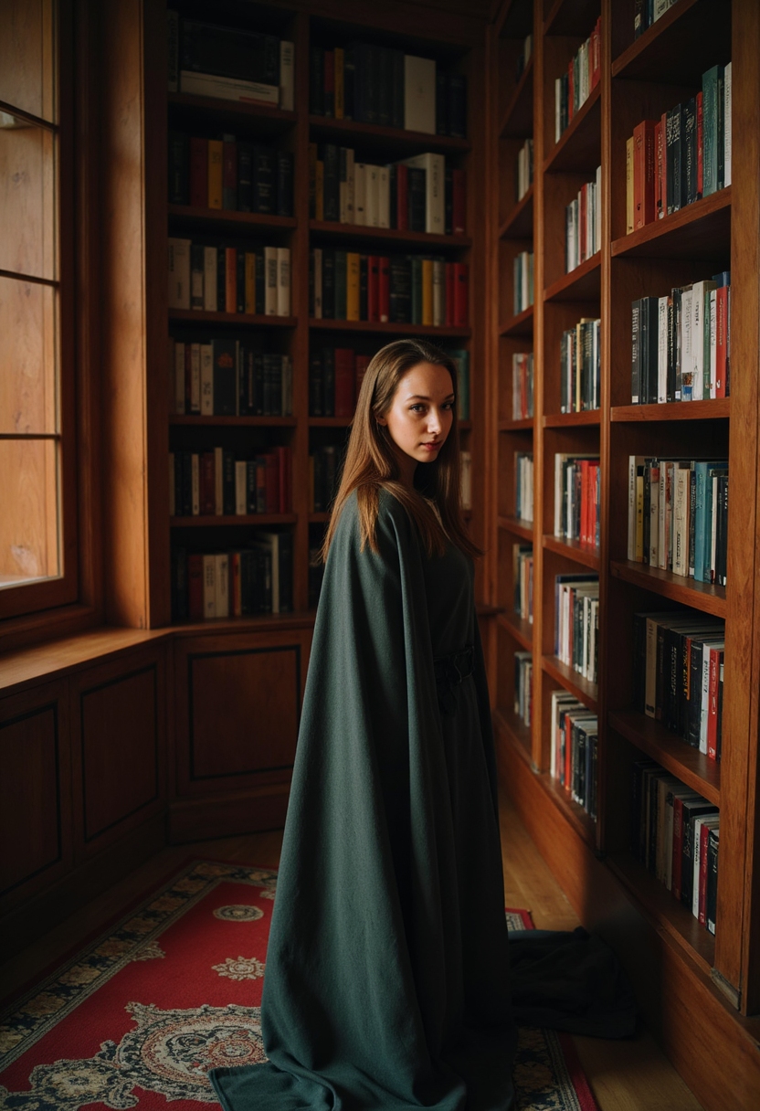 Женщина в тёмно-бордовом платье с бархатным корсетом и серебряными серьгами в форме крестов позирует у огромного окна с витражами. В руках она держит старинную книгу с золотым тиснением. Позади виден массивный камин с горящими свечами. Освещение тёплое, акцент на её украшениях и атмосфере...