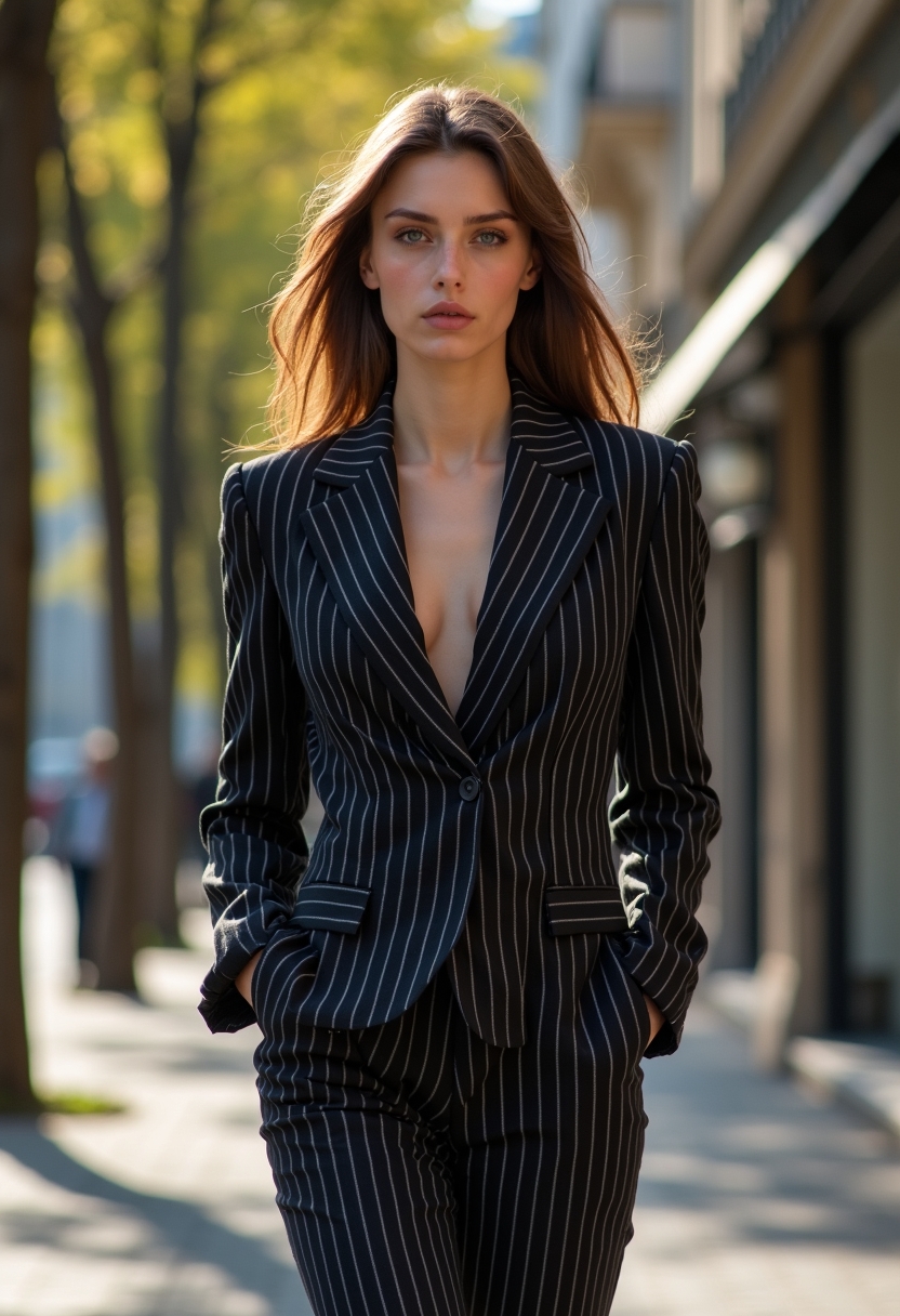 Женщина в стильном брючном костюме с тонкими полосками прогуливается по Елисейским полям, её руки засунуты в карманы, а выражение лица уверенное и слегка загадочное. Позади ряды деревьев и элегантные витрины бутиков. Крупный план, подчёркивающий силу и женственность.