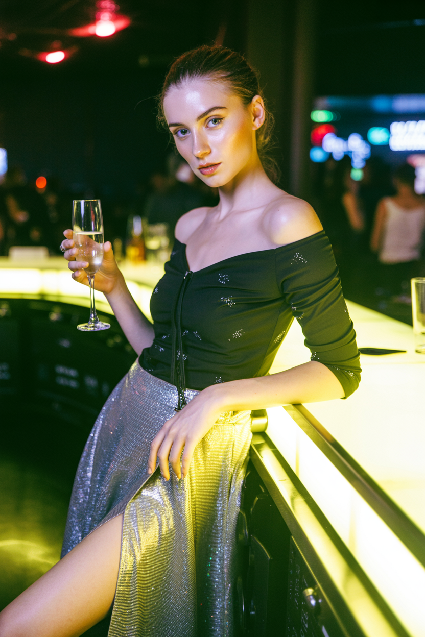 Женщина в стильном клубе, одета в ультрамодный черный топ с открытыми плечами и блестящими деталями, юбку миди из серебристой ткани и лаковые ботильоны, стоит у подсвеченной барной стойки, одной рукой придерживает бокал, смотрит прямо в камеру. Вокруг мерцающие световые пятна, атмосфера вечеринки, мягкие отблески неона.