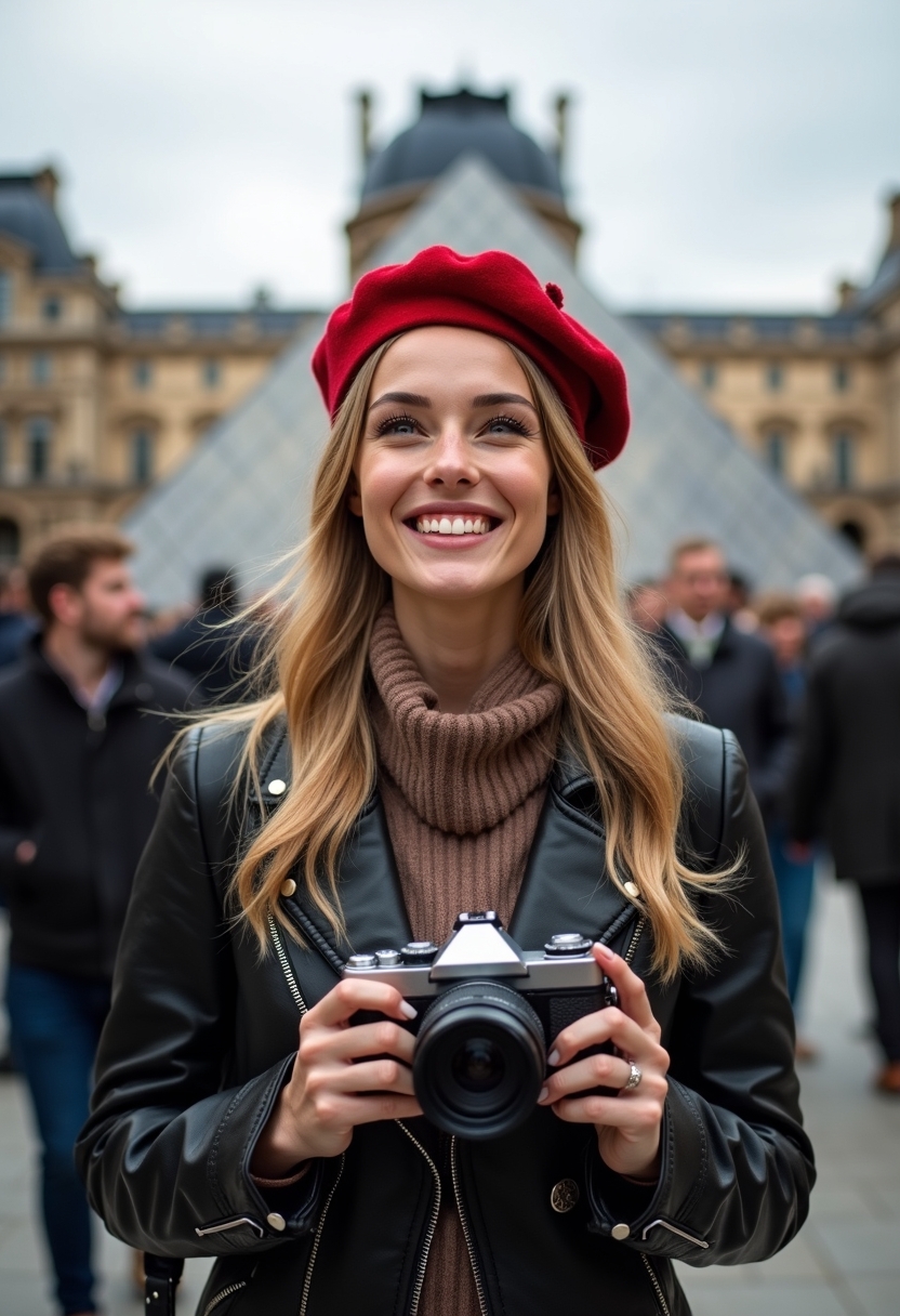 Женщина в стильном красном берете и кожаной куртке стоит у входа в Лувр, её взгляд направлен вверх на стеклянную пирамиду. В руках она держит фотоаппарат, её улыбка тёплая и искренняя. Позади туристы, наслаждающиеся искусством. Крупный план, подчёркивающий атмосферу исследовательского духа.