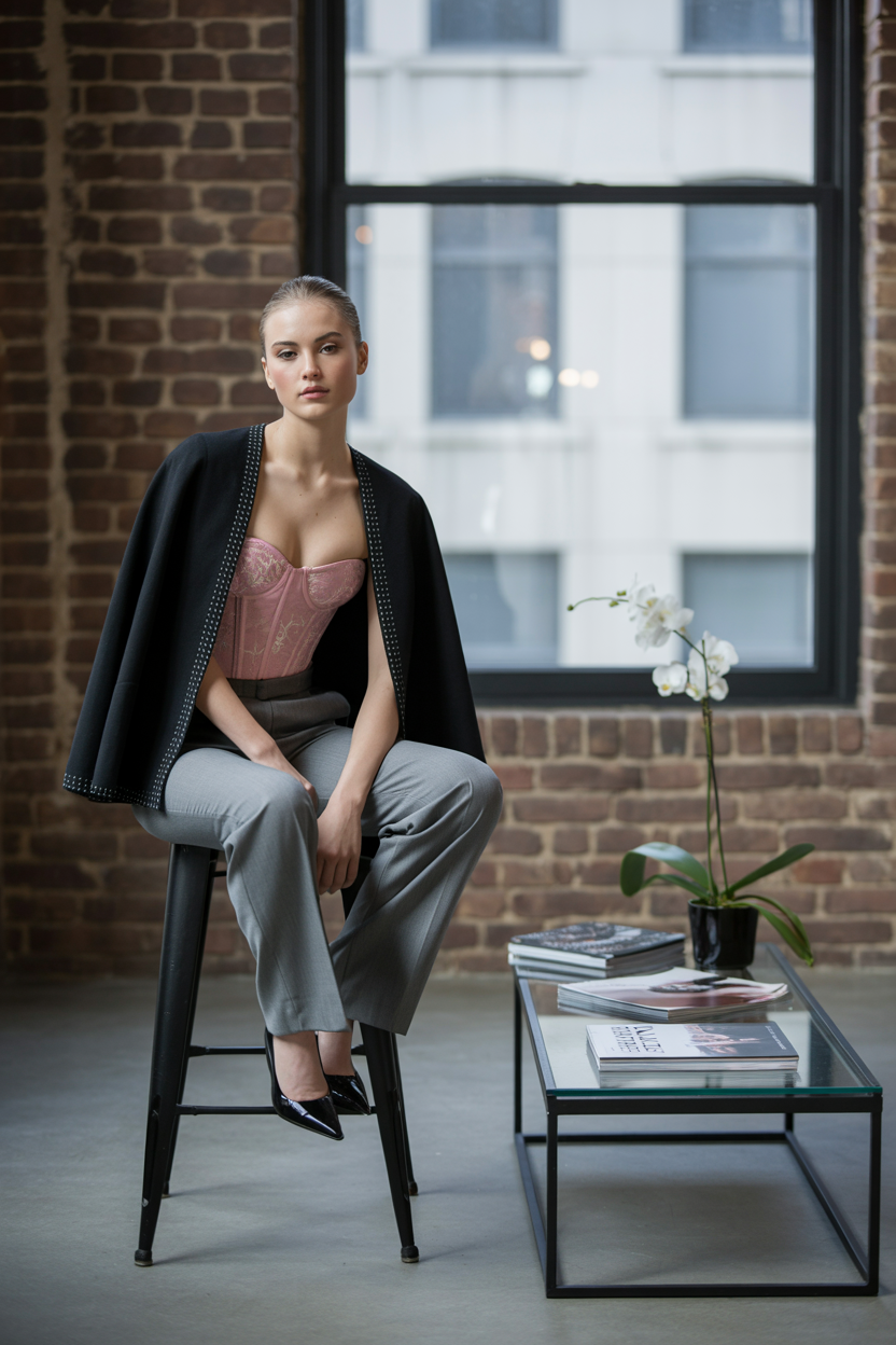 Женщина в стильном лофте с кирпичными стенами, одета в розовый корсет с вышивкой, светло-серые строгие брюки и короткий кейп. Она сидит на высоком барном стуле боком, одну ногу закинув на другую, прямо и уверенно смотрит в камеру, рядом кофейный столик с журналами.