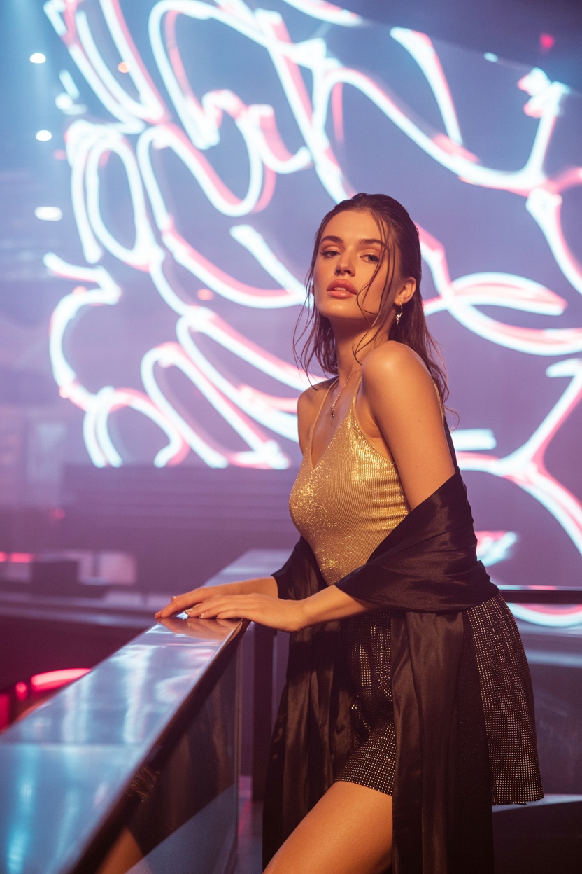 Женщина в стильном ночном клубе, одета в блестящий золотистый топ без рукавов и короткую черную юбку, на плечах прозрачная черная накидка, стоит у мерцающей светодиодной стены, свободной позой оперлась о перила и смотрит прямо в камеру. Вокруг разноцветные огни и легкая дымка, ощущение динамичного вечера.