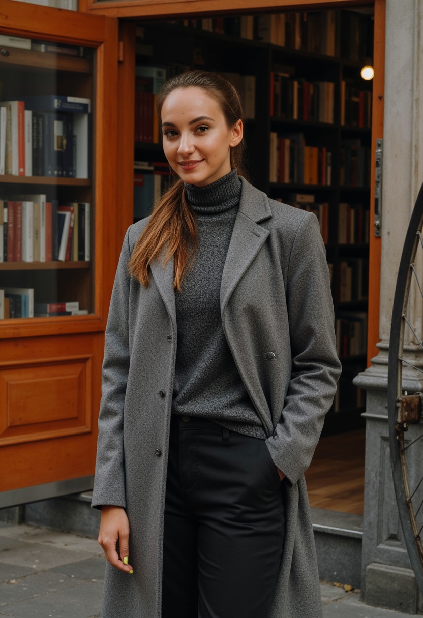 Женщина в стильном пальто стоит у книжного магазина с антикварными книгами, смотрит прямо в камеру, вокруг старинный фасад