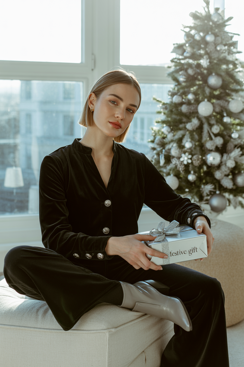 Женщина в стильной дизайнерской квартире рядом с минималистичной наряженной ёлкой, одета в черную бархатную тунику с серебристыми пуговицами и мягкие прямые брюки, на ногах легкие кожаные ботинки. Она сидит на широкой скамье у окна напротив ёлки, держит коробку с подарком, смотрит прямо в камеру, свет заливает комнату.