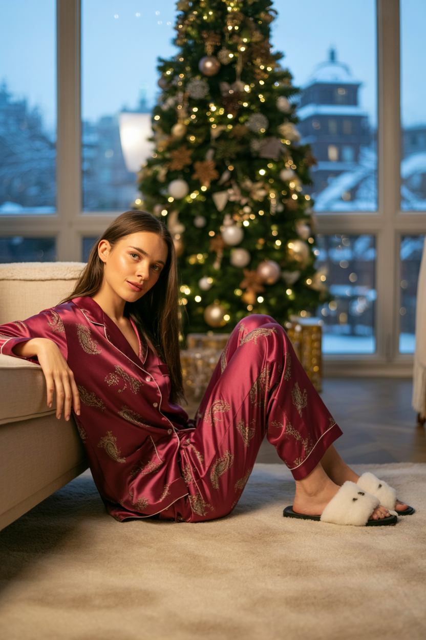 Женщина в стильной гостиной с панорамными окнами у сверкающей новогодней ёлки, одета в шелковую длинную пижаму бордового цвета с мелким золотым узором и пушистыми тапочками. Она лежит на мягком ковре, опираясь на локоть, смотрит прямо в камеру, вокруг елочные украшения и разбросанные мишуры.