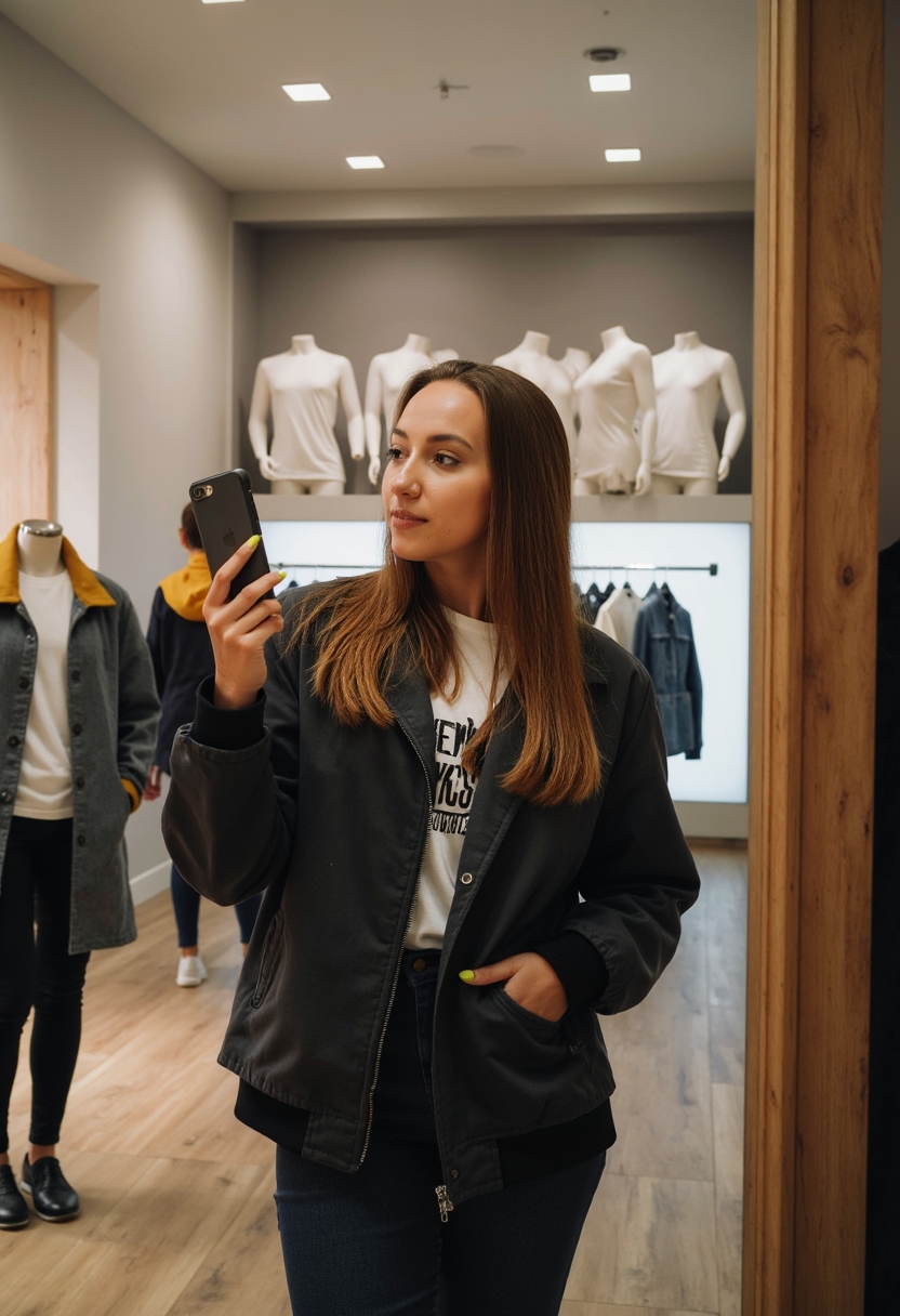 Женщина в стильной куртке делает селфи в зеркале торгового центра, за спиной манекены и яркие витрины