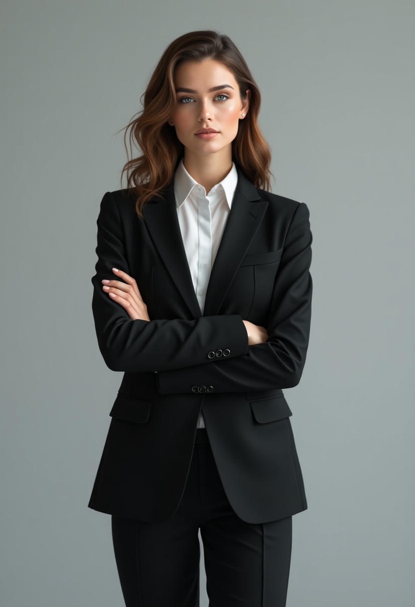 Женщина в строгом деловом костюме на нейтральном сером фоне, смотрит прямо в камеру, мягкое студийное освещение
