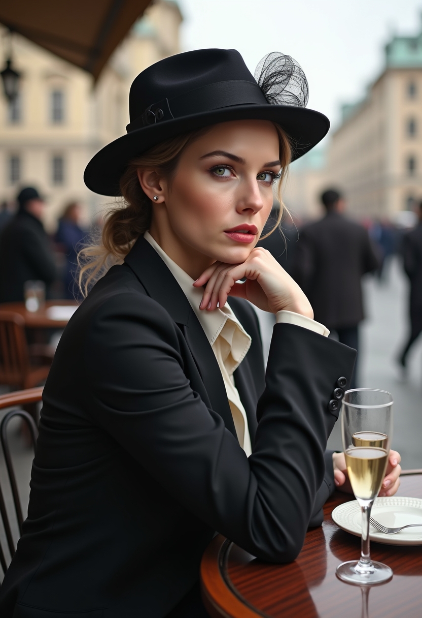 Женщина в строгом костюме и шляпе с вуалью сидит за столиком кафе, её руки держат бокал вина, а губы слегка приоткрыты. Позади Дворцовая площадь с проходящими пешеходами. Крупный план, создающий ощущение аристократичности и старинного Петербурга.