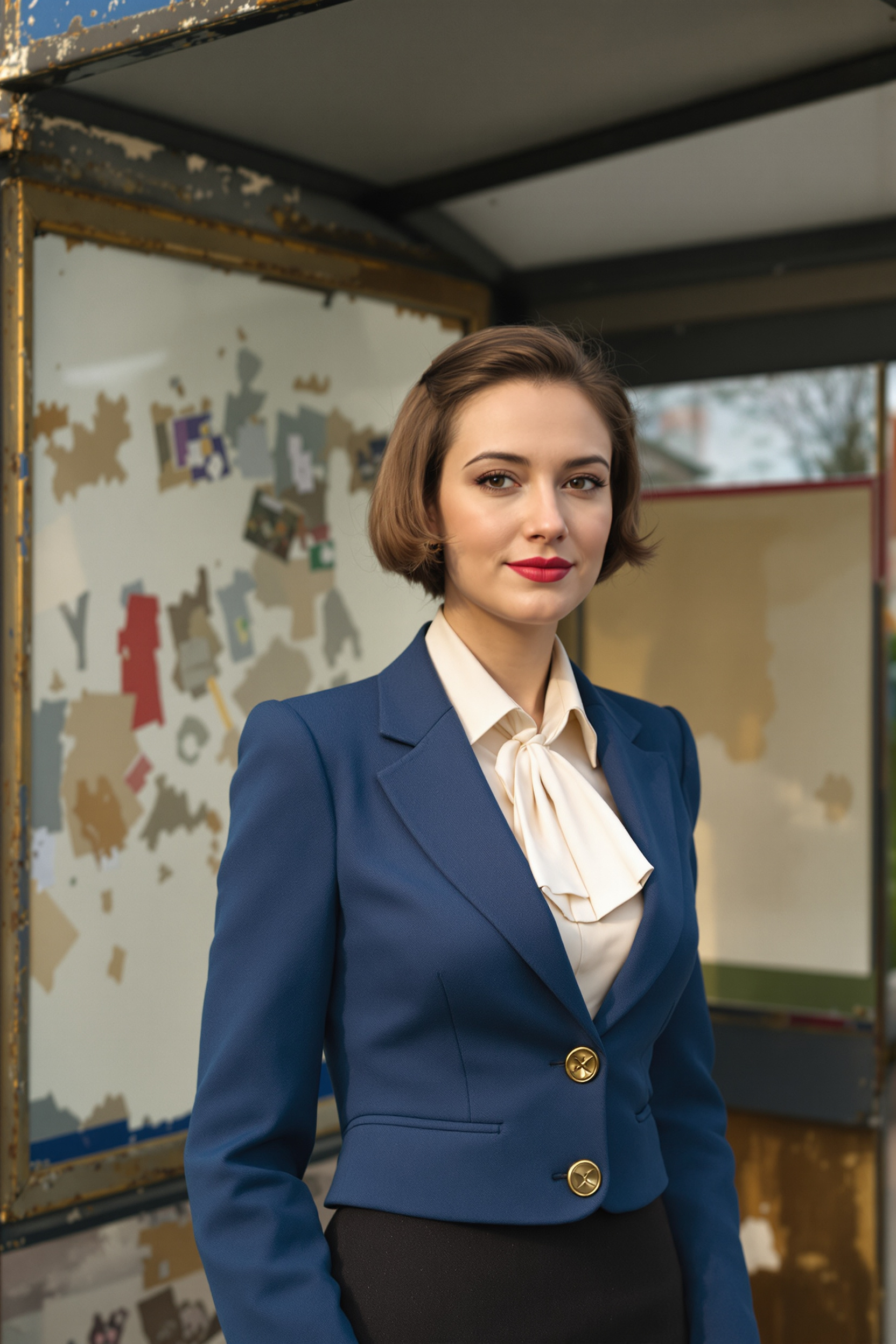 Женщина в строгом синем пиджаке и темной юбке-карандаш, под пиджаком светлая блузка с жабо и крупными пуговицами, аккуратная классическая причёска. Стоит у облупленного остановочного павильона, средний план, смотрит в камеру, теплый пленочный свет 80-х.