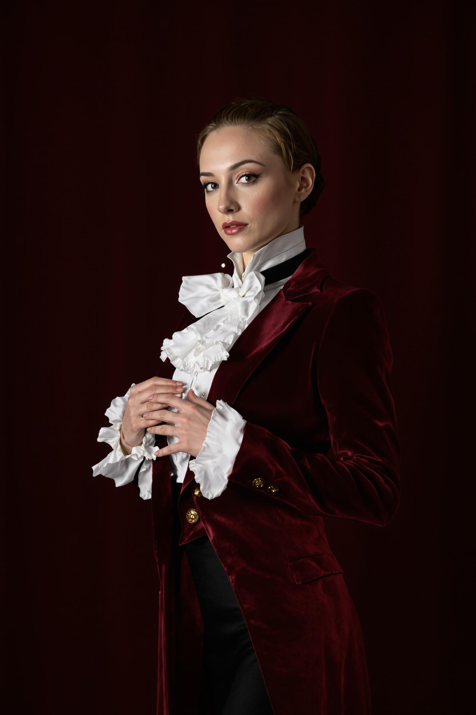 Женщина в строгом театральном фраке цвета насыщенного вина, под ним накрахмаленная белая рубашка с высоким воротником и асимметричным бантом-бабочкой. Стоит боком, обе руки замыкает на уровне груди в трапециевидный жест, смотрит прямо в камеру, фон — тёмно-бордовый бархат.