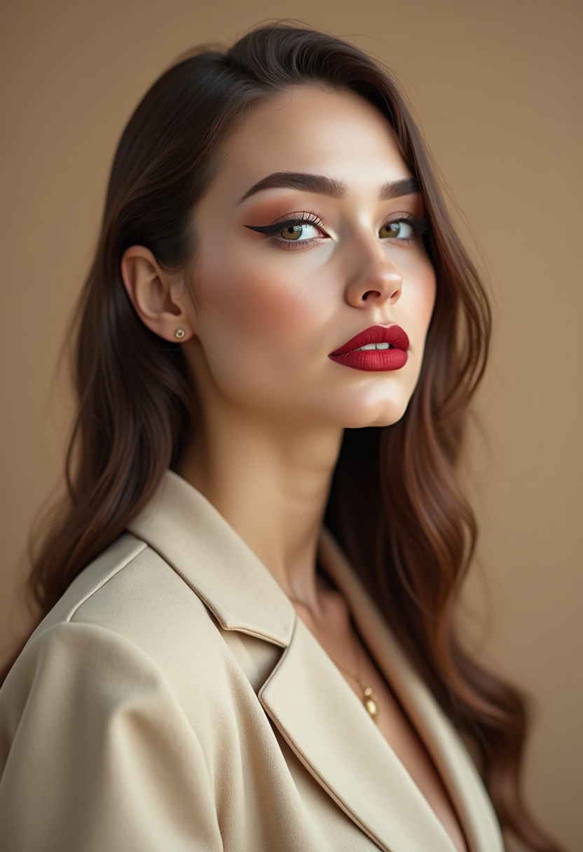 Женщина в строгом жакете бежевого оттенка сидит прямо, подбородок слегка приподнят, взгляд направлен вверх и в сторону. Макияж с выразительными алыми губами, графичными стрелками и идеально матовым тоном кожи. Волосы гладко уложены, бежевая циклорама подчёркивает строгий образ. Крупный план.