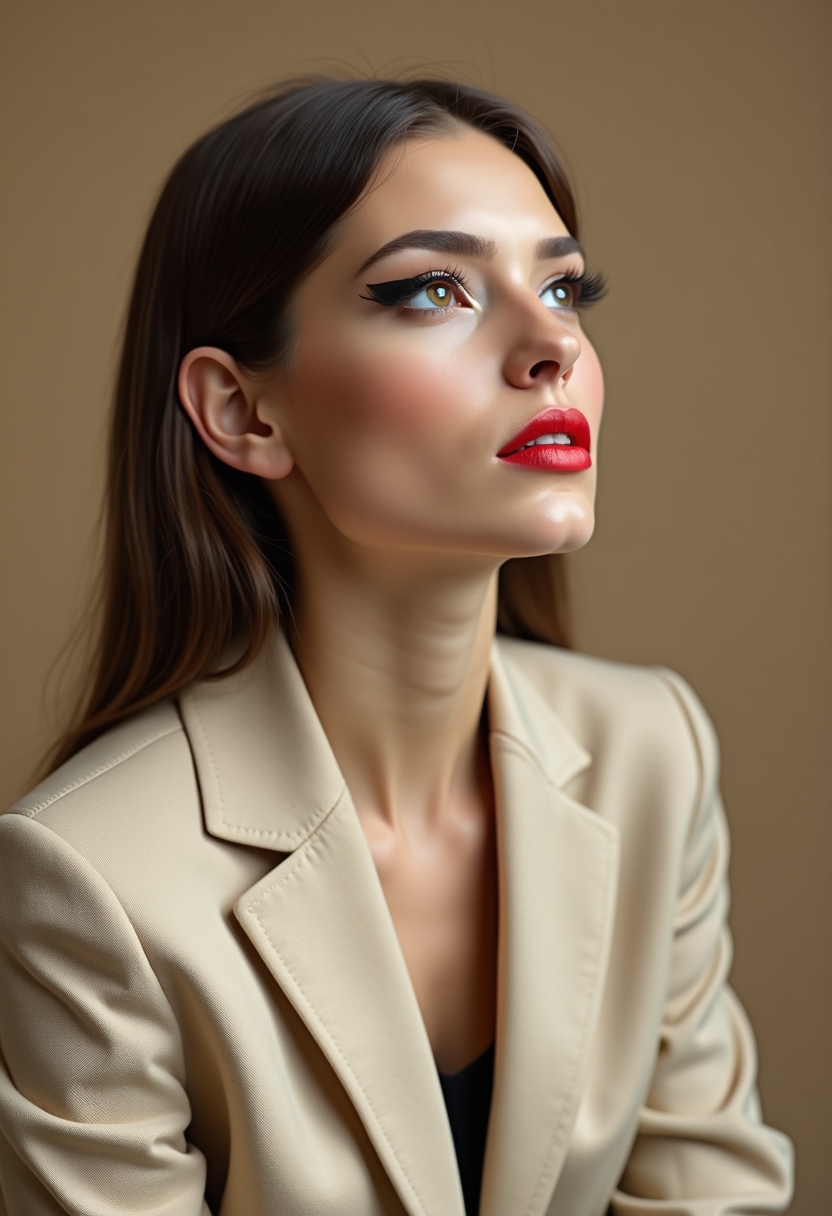 Женщина в строгом жакете бежевого оттенка сидит прямо, подбородок слегка приподнят, взгляд направлен вверх и в сторону. Макияж с выразительными алыми губами, графичными стрелками и идеально матовым тоном кожи. Волосы гладко уложены, бежевая циклорама подчёркивает строгий образ. Крупный план.