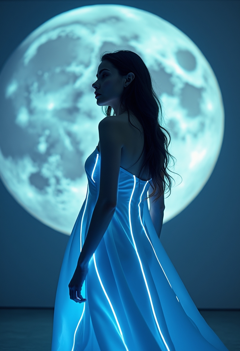 Женщина в струящемся футуристическом платье с неоновой подсветкой вдоль швов стоит перед проекцией Луны. Её взгляд направлен вверх, лицо освещено мягким светом. Крупный план, создающий атмосферу будущего и мечты.