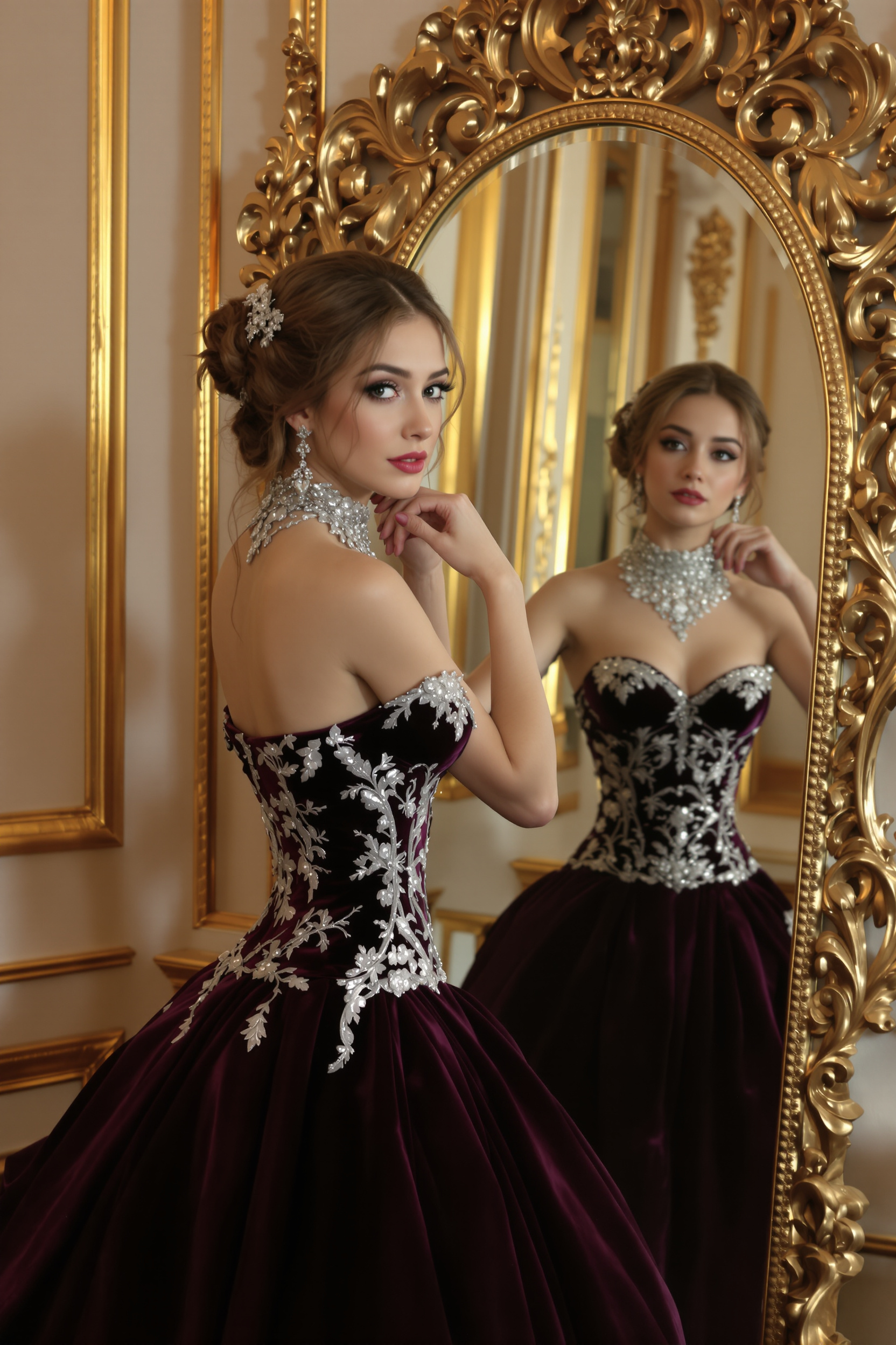 Женщина в струящемся темно-фиолетовом платье с бархатным корсетом и серебряной вышивкой стоит у роскошного резного зеркала, аккуратно надевает на шею изысканное ожерелье, уверенно смотрит в камеру, позади золотистые детали интерьера.