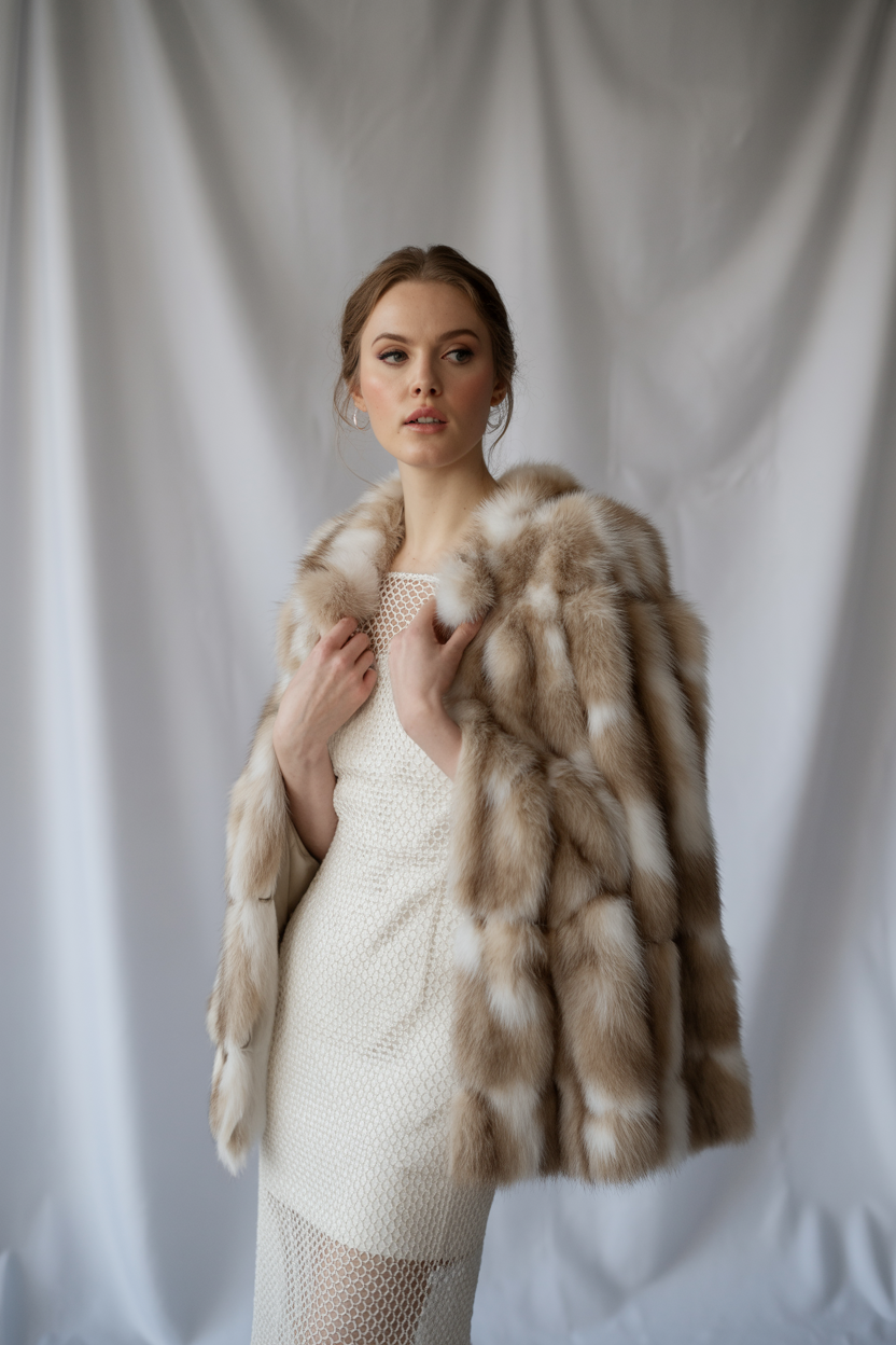 Женщина в студии на белом фоне в роскошной соболиной шубе классического фасона, под шубой изящное белое кружевное платье-футляр. Стоит прямо, слегка наклонив голову, смотрит в камеру, на лице естественный макияж, распущенные волосы аккуратно уложены, образ мягкий и утончённый.