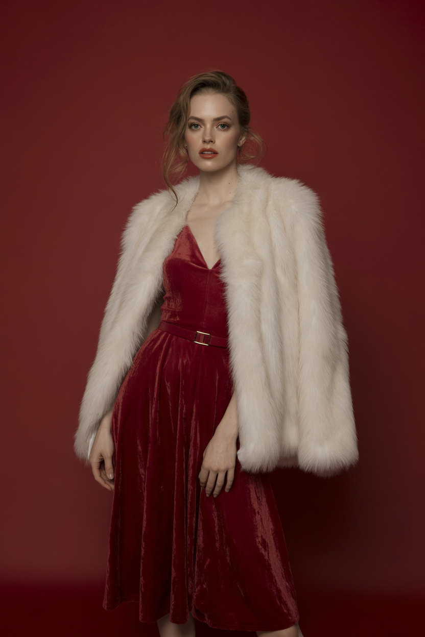 Женщина в студии на красном фоне в роскошной белой шубе, под шубой алое бархатное платье миди с тонким поясом. Стоит в уверенной позе, смотрит прямо в камеру, макияж гламурный с акцентом на губы, распущенные волосы струятся по плечам, образ праздничный и яркий.
