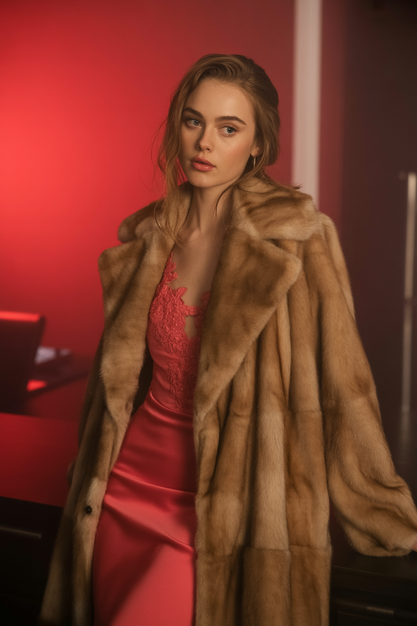 Женщина в студии на красном фоне в роскошной норковой шубе карамельного цвета, под ней алое приталенное платье с кружевным декором. Стоит в уверенной позе, смотрит прямо в камеру, волосы свободно лежат на плечах, макияж гламурный с выразительными глазами, образ праздничный и яркий.