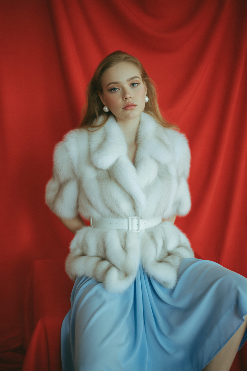 Женщина в студии на красном фоне в ярко-белой норковой шубе с широким поясом, под шубой струящееся светло-голубое платье миди с мягкими складками. Стоит в изящной позе, смотрит прямо в камеру, волосы распущены, на лице естественный макияж. Образ дополняют жемчужные серьги.