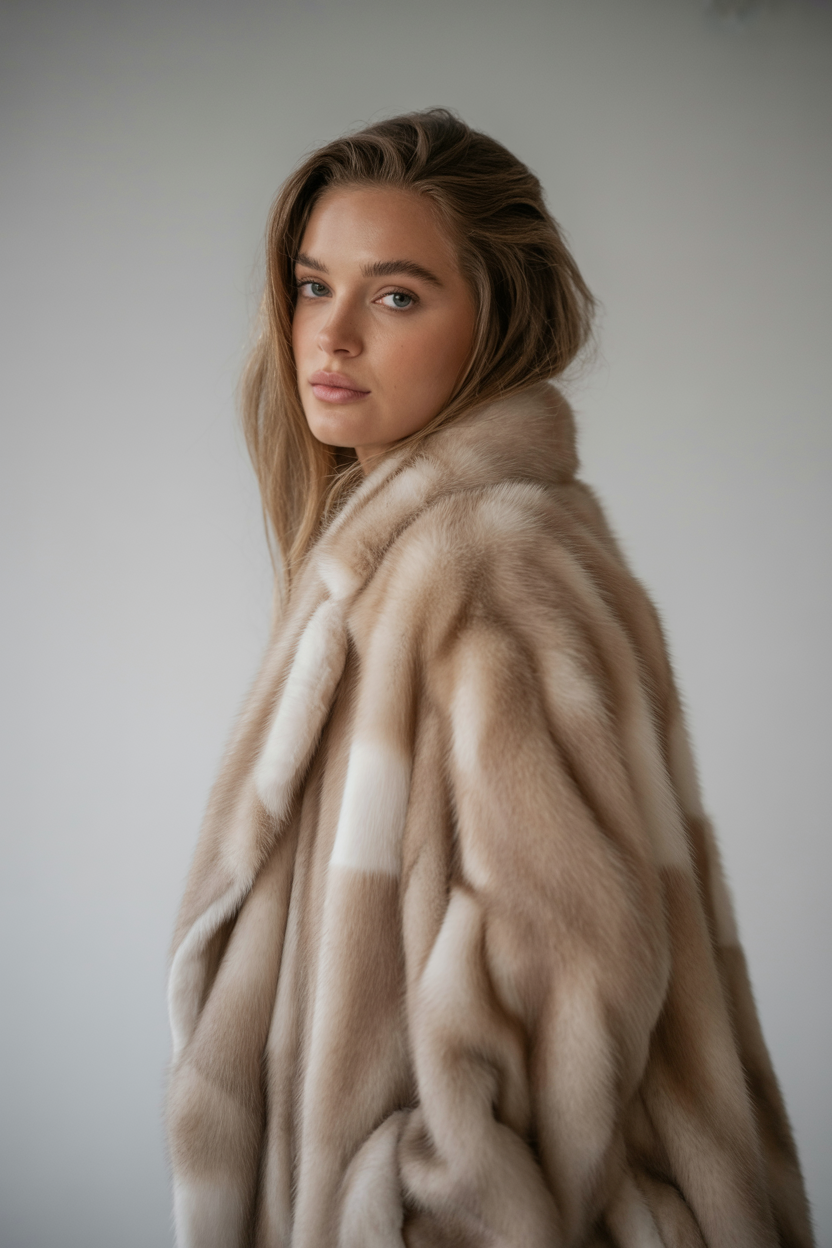 Женщина в студии на светлом фоне в длинной норковой шубе оттенка шампань, играет свет в густом благородном мехе, стоя вполоборота и уверенно глядя в камеру. На лице естественный макияж, распущенные волосы, ретро-атмосфера создаёт ощущение шикарной журнальной съемки.
