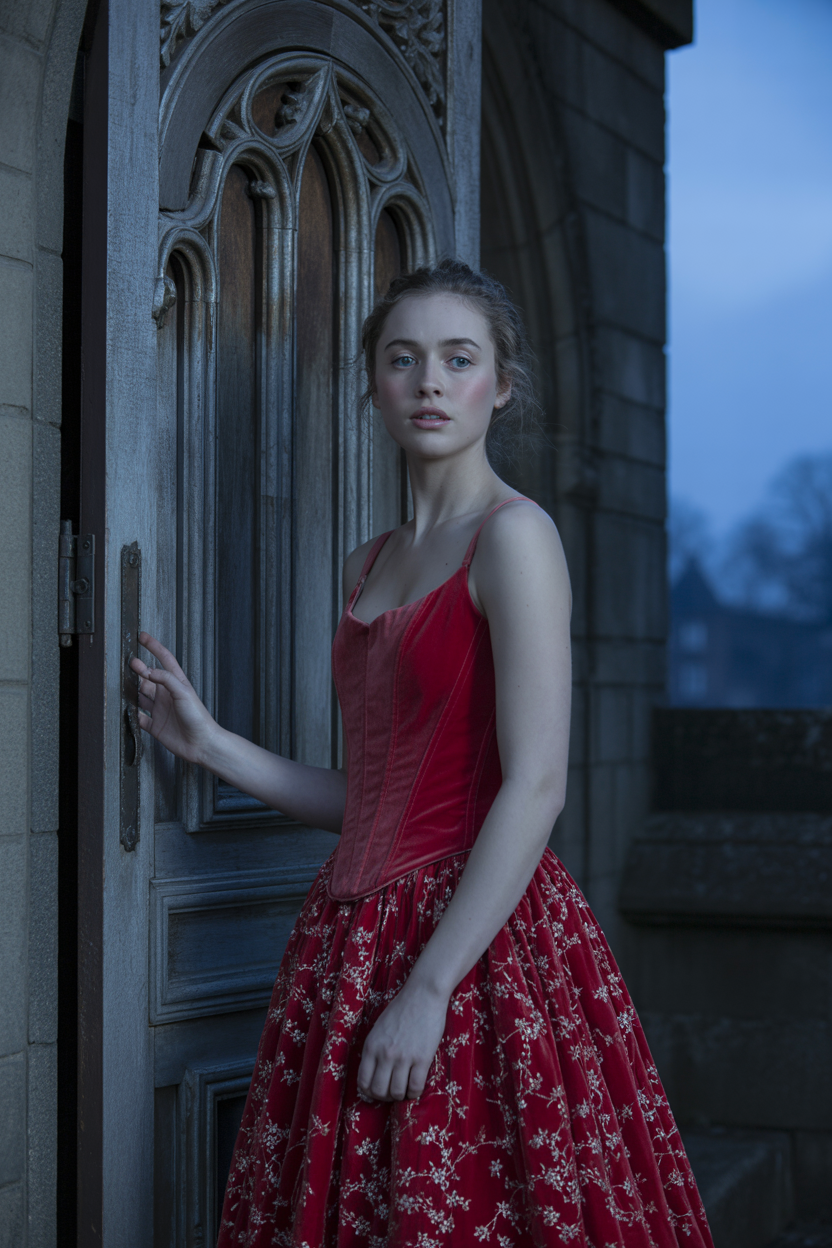 Женщина в сверкающем алом платье с бархатным корсетом, объёмной юбкой и изящной вышивкой серебром стоит у массивной резной двери готического замка. Она смотрит прямо в камеру, одна рука слегка придерживает подол платья. Атмосфера тайны, свет мягко подсвечивает её силуэт.