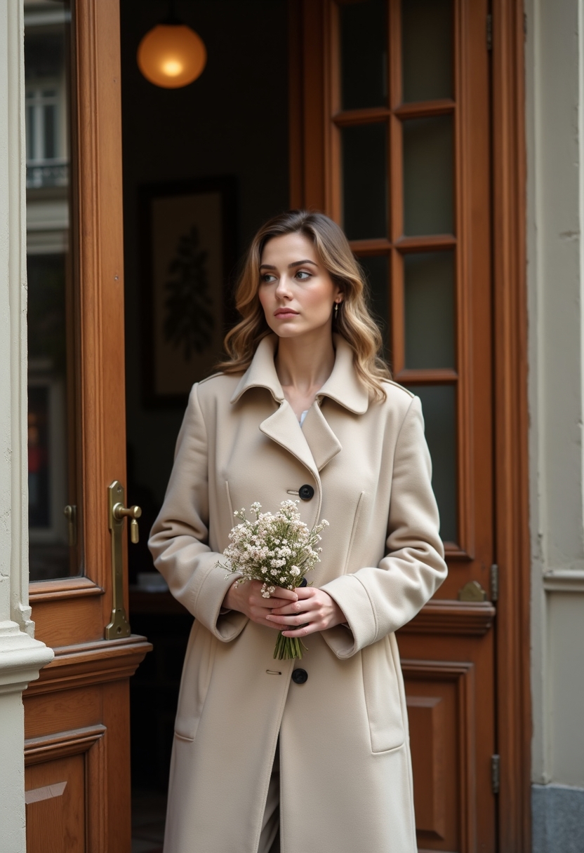 Женщина в светло-бежевом пальто с высоким воротником стоит у входа в кафе, расположенное в старинном здании с лепниной. Её взгляд направлен вдаль, а руки держат небольшой букет цветов. Позади видны деревянные двери с металлическими деталями. Освещение утреннее, акцент на её изящности и деталях...