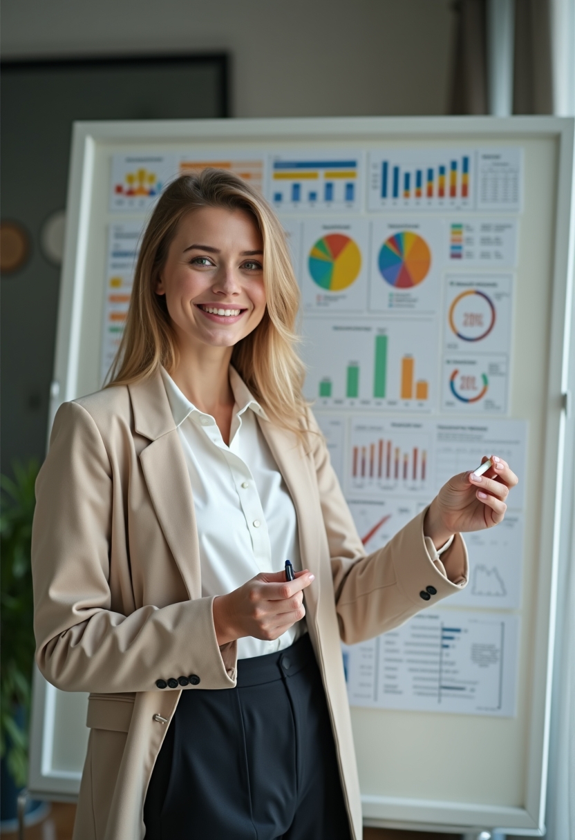 Женщина в светло-бежевом жакете и тёмных брюках стоит у офисной доски с графиками, в руке держит маркер. Она улыбается, смотря в камеру, позади — деловой интерьер. Крупный план.