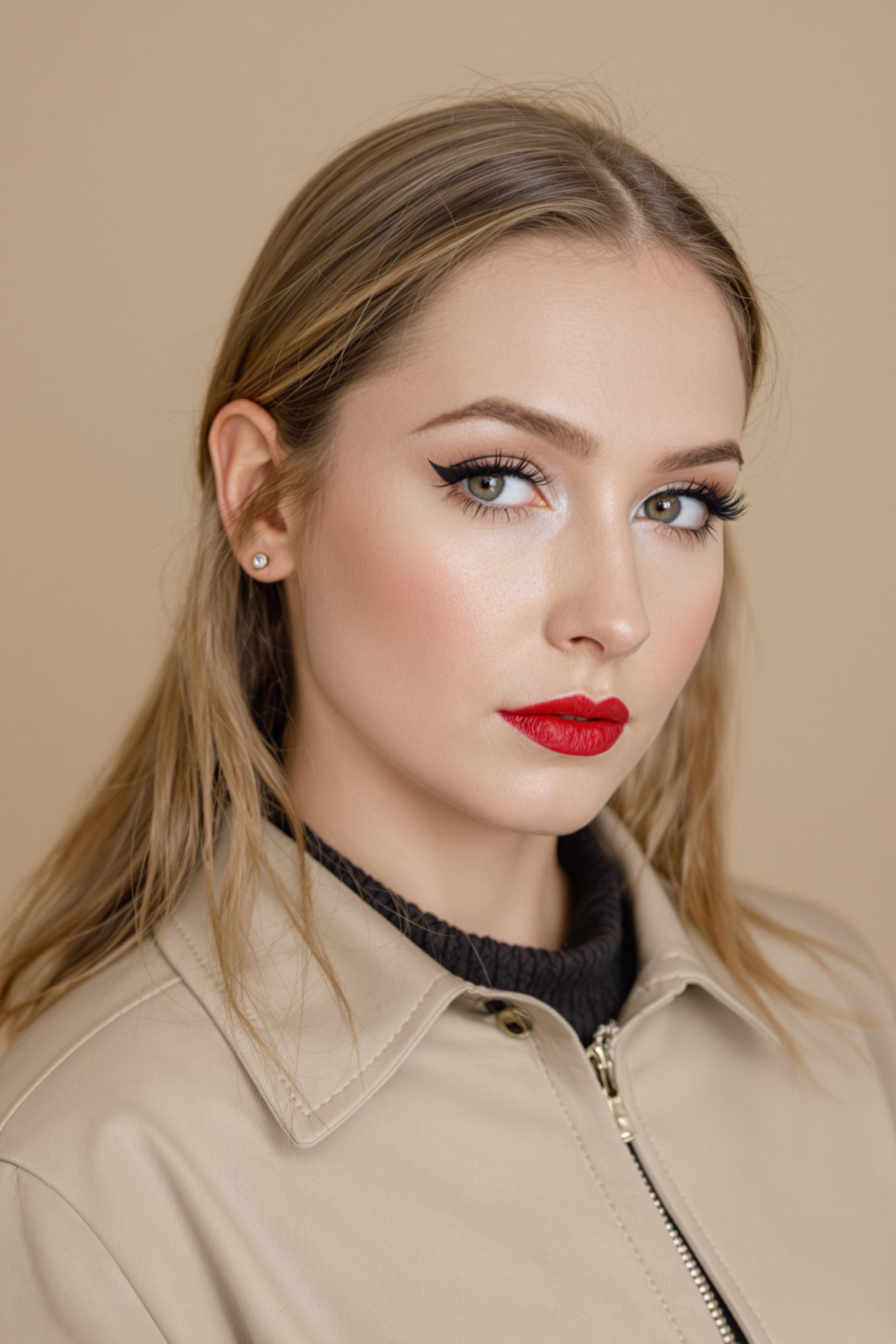 Женщина в светло-бежевом жакете, крупный план лица. Голливудский макияж: графичные чёрные стрелки, длинные ресницы, фарфоровая матовая кожа, губы ярко-алого оттенка. Аккуратно уложенные назад волосы. Взгляд уверенно направлен в камеру, фон — бежевая циклорама.