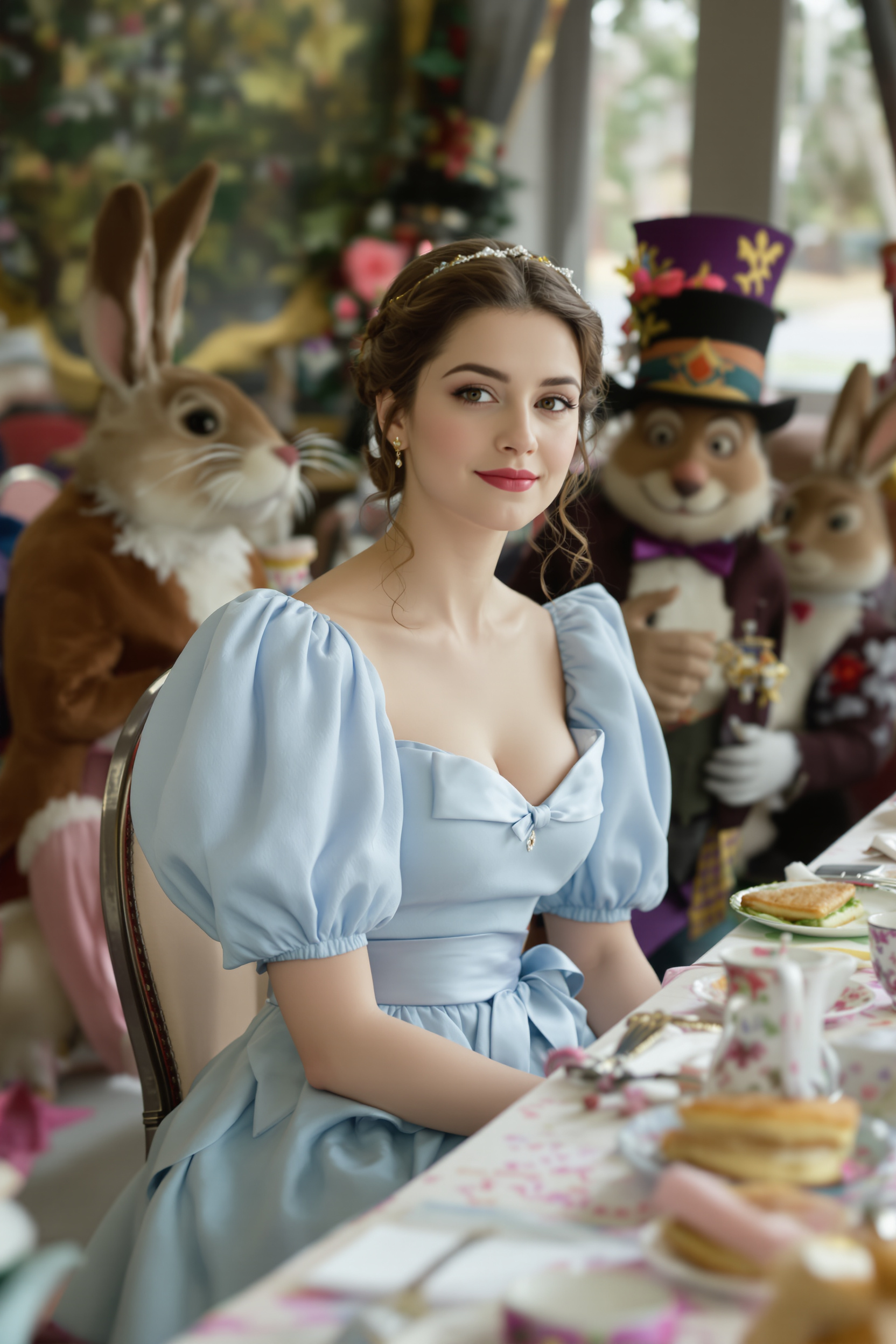 Женщина в светло-голубом винтажном платье с пышными рукавами и атласной лентой на талии сидит за длинным столом для чаепития, вокруг суматошные Мартовский заяц и Безумный Шляпник, на скатерти сервиз и бутерброды, средний план, взгляд прямо в камеру.