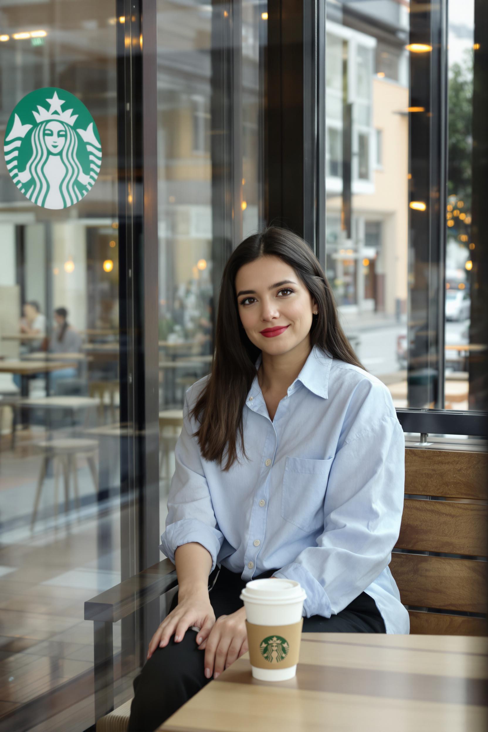 Женщина в светло-голубой oversize рубашке и чёрных прямых брюках сидит у окна в кофейне Starbucks. Перед ней стакан фирменного кофе, на фоне фирменная зелёная символика и деревянные столы. Она смотрит прямо в камеру, на лице лёгкая улыбка, средний план.