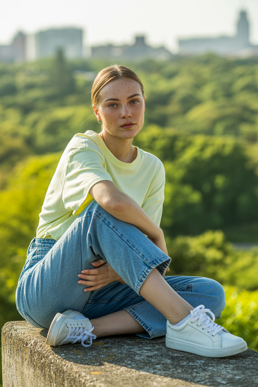 Женщина в светло-голубых джинсах mom fit и базовой светло-желтой футболке свободного кроя, на ногах белые минималистичные кеды. Она сидит на бетонной плите в парке, одну ногу согнула и обняла руками, вторая нога вытянута. Спокойный уверенный взгляд прямо в камеру, крупный план, зелёный городской фон.