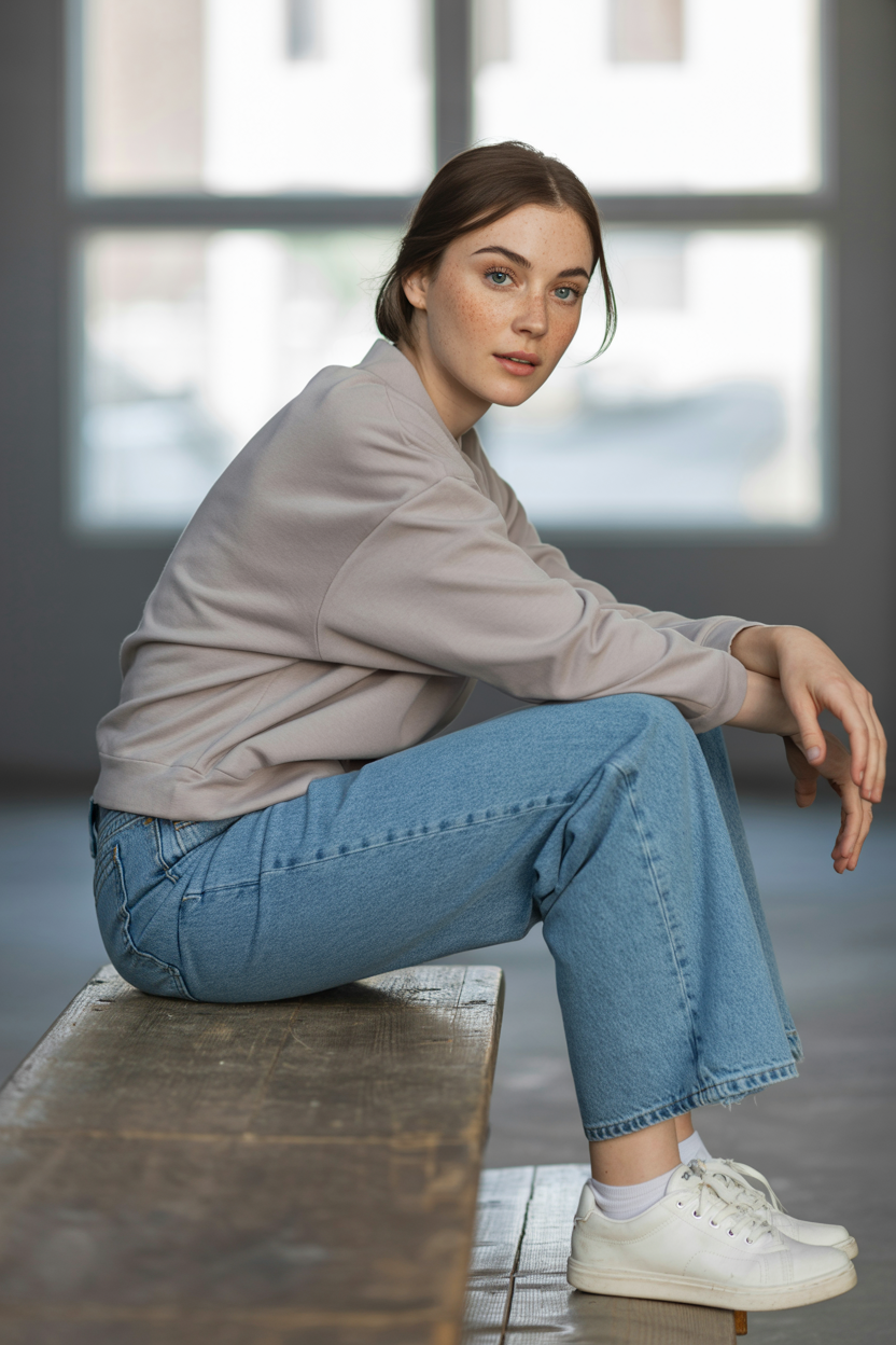 Женщина в светло-голубых джинсах mom fit с небольшой потертостью и светло-бежевом свитере свободного силуэта с объемным воротником. На ней белые кеды без декора. Она сидит боком на широкой деревянной скамье у большой студийной витрины, одну ногу согнула, локоть оперла на колено, уверенно смотрит в камеру. Крупный план, мягкий дневной свет.