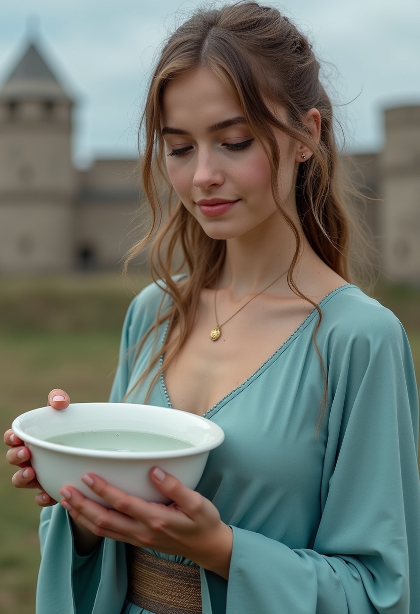 Женщина в светло-лазурном наряде держит в руках белую керамическую чашу, наполненную свежей водой. Она аккуратно касается её краёв пальцами, позади размытые очертания древней крепости. Ближний план, подчёркивающий историческую атмосферу сцены.