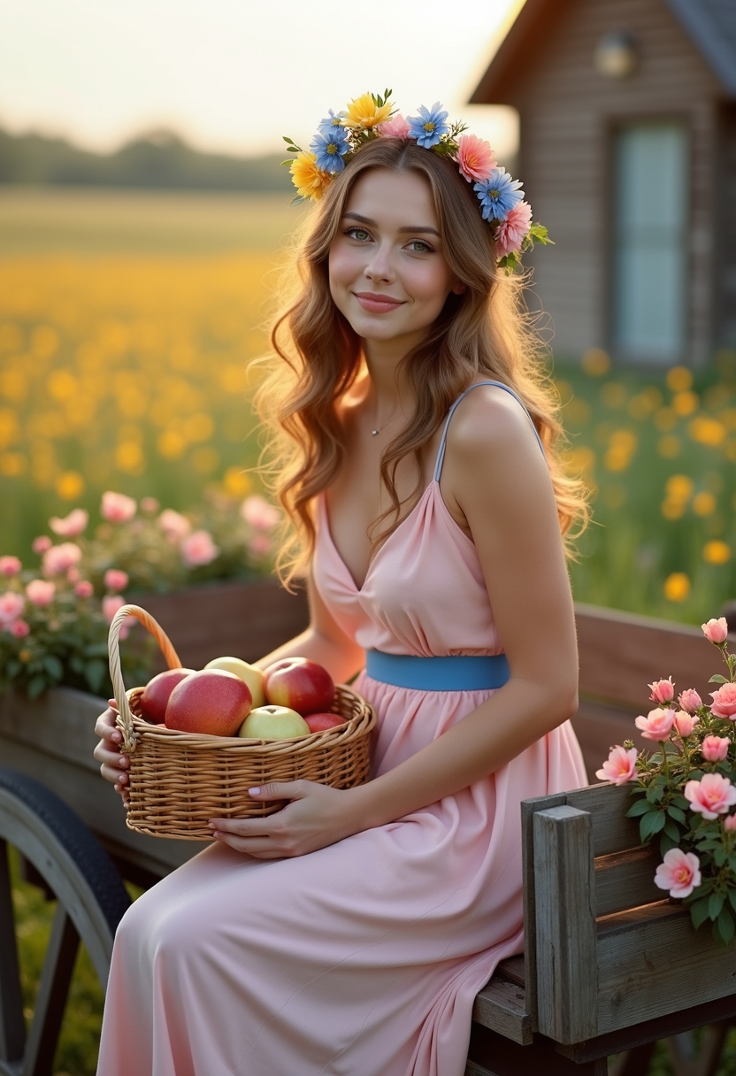 Женщина в светло-розовом сарафане с голубым поясом и венком из васильков сидит на деревянной телеге, украшенной цветами. В руках она держит плетёную корзину с яблоками и смотрит на камеру с нежной улыбкой. Позади видны цветущие поля и небольшой деревянный дом. Освещение тёплое, акцент на её лице и...